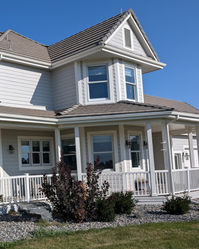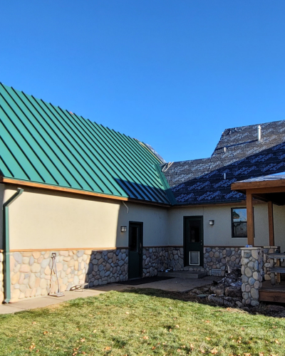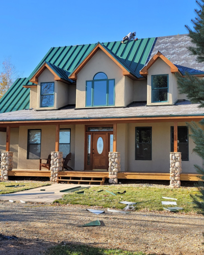 Elite performed a metal standing seam re-roof after hail damage on a steep slope, with compound metal bends bent onsite in 22 gage Colonial Green. Scope also included Main House Re-roof, Windows, Stain of Porch, Doors (Garage and Man door), Custom Gutters, Stucco Repair and Fog Coat, Stone Veneer, Ice Guards.